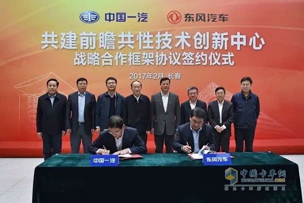 2017年2月17日,东风汽车公司(以下简称“东风公司”)与中国第一汽车集团公司(以下简称“中国一汽”)共同创建“前瞻共性技术创新中心”战略合作框架协议签约仪式在长春举行。这是中国汽车领域领军企业——东风公司和中国一汽,充分利用自身的资源优势,加强央企协同协作,加快核心技术能力构建的一次重要实践,体现了中央企业积极推动汽车强国战略的责任与担当。