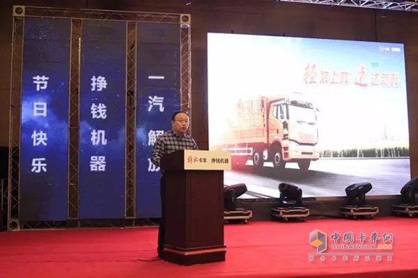一汽解放汽车销售有限公司客户关系管理部部长王宏巍先生致辞: “解放将朝着‘国内领先,国际一流’的目标破浪前行,把解放打造成为‘最值得骄傲的汽车企业,最值得信赖的卡车品牌’!让使用解放卡车的用户富裕起来,让使用解放卡车的企业发展起来,让使用解放卡车的地区繁荣起来。”