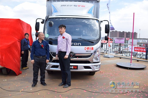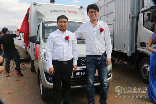 福田轻型商用车事业本部奥铃营销传播部部长孙菲先生与百万公里名人堂用户张玉先生为奥铃CTS超级轻卡揭幕