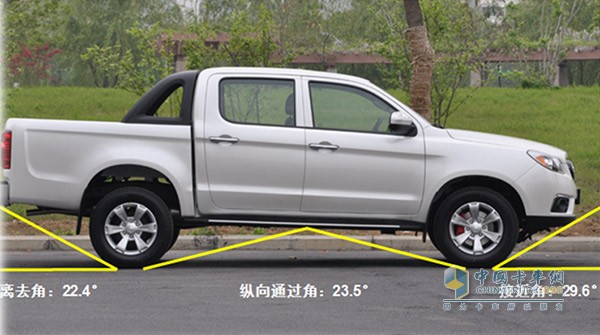 帅铃T6 29.6°的前接近角和22.4°的离去角以及23.5°的纵向通过角增强车辆通过性能