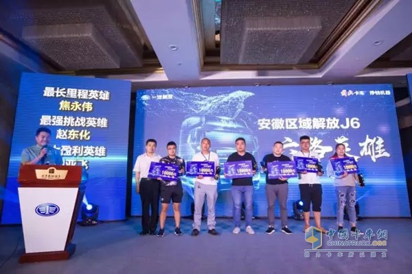一汽解放安徽商代处总经理张传利先生为六大英雄颁发了奖品和奖杯。作为解放J6用户的杰出代表,他们表示:能获得这项荣誉非常开心,未来会一如既往地支持解放,也相信一汽解放新J6定能给卡友创造更大的价值。