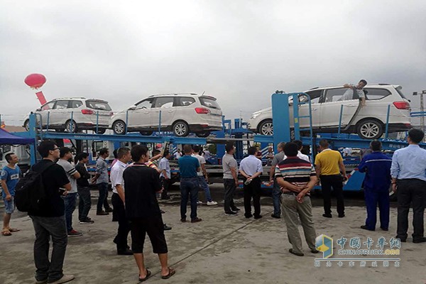 在活动现场,络绎不绝的用户详细了解了红岩杰狮中置轴轿运车,并亲身进行了装车操作、试乘试驾,现场气氛隆重而热烈,对红岩杰狮中置轴轿运车的优异表现赞不绝口,并现场签订了批量订单。