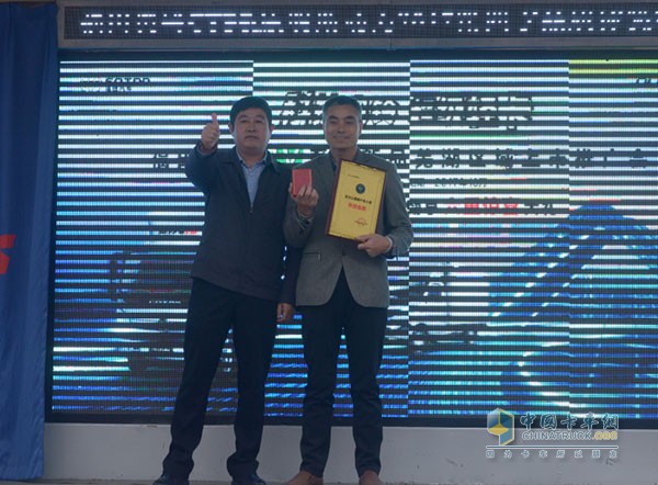 福田轻型商用车事业本部奥铃安徽市场部经理鞠学武先生(左)为百万公里客户季昌发先生(右)授予福田奥铃百万公里客户名人堂荣誉会员奖牌