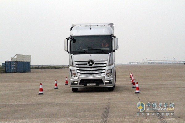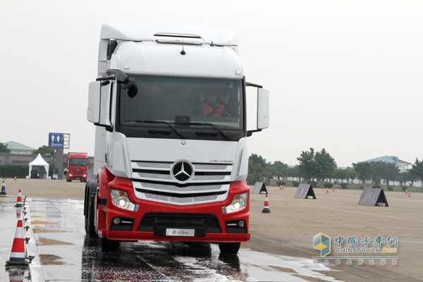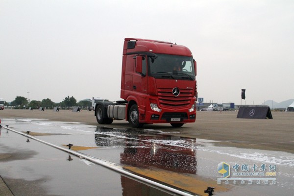 特别是在湿滑道路的演示环节,为更好的体现奔驰新Actros的制动安全性,分别设置在干路面、半干半湿路面及全湿路面的制动展示,模拟车辆在正常路面(制动摩擦力均匀)、湿滑路面(左右制动摩擦力不均匀)及雨雪路面(制动摩擦力较小)状态下的紧急制动,对比发现,奔驰新Actros每一次都能轻松站稳,而且在最危险的全湿路面制动时,驾驶员双手离开方向盘,车辆无甩尾、无偏移稳稳的停住,让一群老司机惊叹不已。