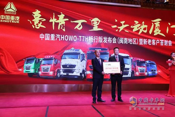 活动现场,厦门亿元达汽车销售有限公司则获得中国重汽HOWO-T7H厦门漳州总代理的殊荣,张家胤为其授牌。