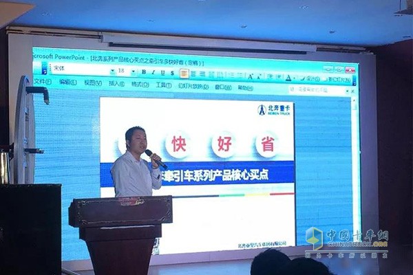 北奔重汽河南分公司王玮经理围绕着北奔重卡产品的最大优点“多、快、好、省”给大家做了详细的讲解,北奔重卡军工品质,质量过硬,对产品质量严格把关,在技术降重的同时保证车辆的稳定性,安全性,“降重不降质”,承载多,跑得快,保修期长,诸多方面的优点吸引客户都认真聆听。