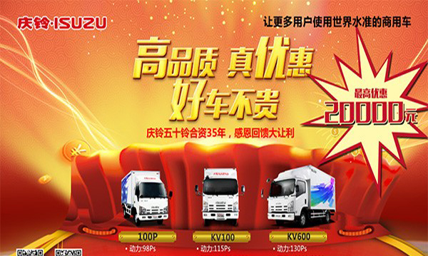 2019年5月,夏未至春已末,除了母亲节外,也正好恰逢庆铃、五十铃合资合作35年重要时刻,在这个充满感恩的月份,庆铃汽车为感恩客户长期以来对庆铃汽车的信赖与支持,携旗下100P/KV100/KV600等明星轻卡车型开展了以“高品质、真优惠、好车不贵”为主题的系列产品促销活动,用超值钜惠来帮用户创造幸福生活。