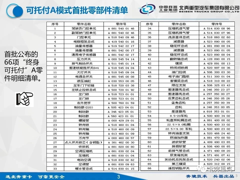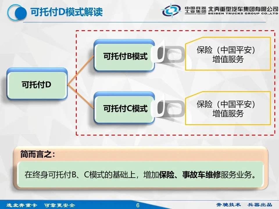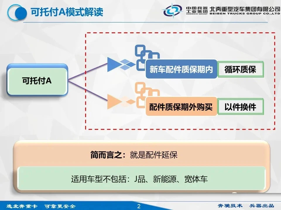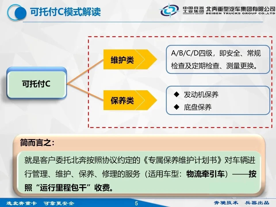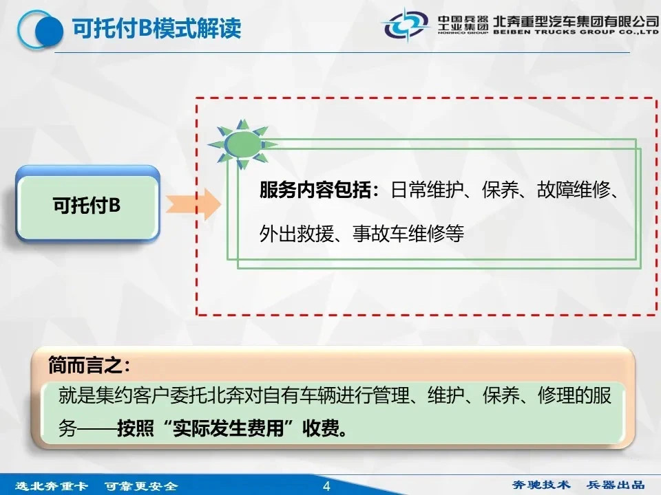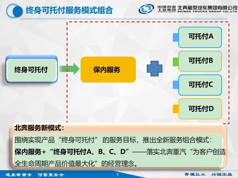 “终身可托付A”模式是针对配件的延保,包括新车配件质保期内循环质保、配件质保期外以件换件。目前,66项零件属于“终身可托付”A零件;“终身可托付B”模式服务内容包括:日常维护、保养、故障维修、外出救援、事故车维修等,集约客户委托北奔对自有车辆进行管理、维护、保养、修理的服务时按照“实际发生费用”收费,适用范围为北奔在产的牵引车、自卸车、搅拌车等车型;“终身可托付C”模式是一种客户按车辆运营里程承担费用的有偿服务模式,客户购车之后,后期维护全部交由北奔公司专业的售后维护团队,按照行驶里程及实际用车情况,进行专业的维护保养;“终身可托付D”是在终身可托付B、C模式的基础上,增加保险、事故车维修服务业务。