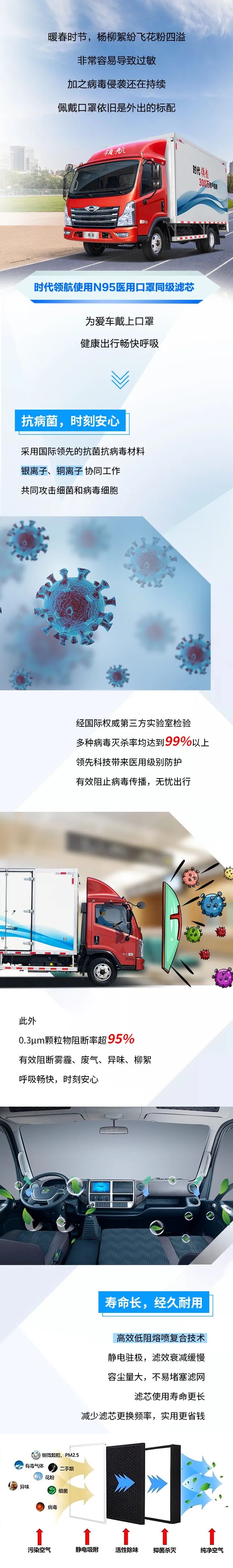 时代领航使用N95医用口罩同级滤芯,为汽车戴好口罩,全面守护健康,安全放心出行。