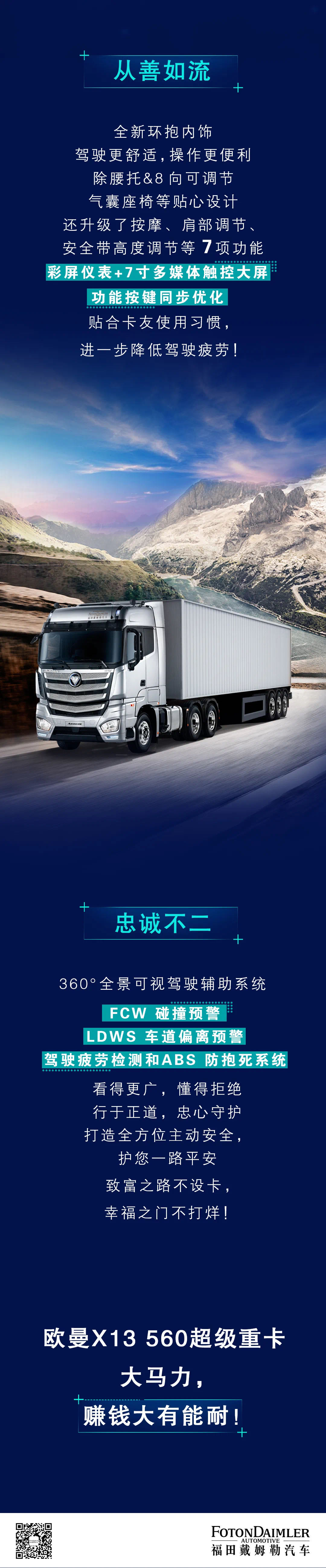 大马力,才有大能耐。欧曼X13 560超级重卡,搭载康明斯X系列发动机,马力大,油耗小,出勤高,让卡友的生活越来越好!