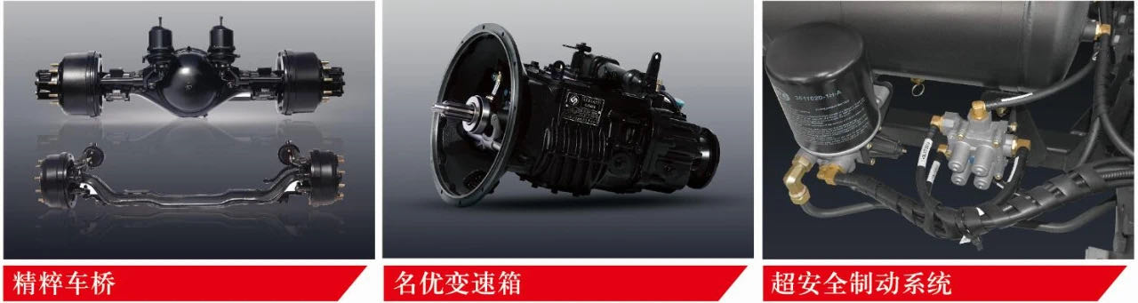 匹配潍柴WP7卡车动力专用发动机,动力强,高可靠,轻松应对各种工况,燃油消耗率低;国内著名精粹车桥,品质卓越,承载力强;法士特双中间轴变速箱,重量轻,成熟可靠,整车动力匹配更高效。