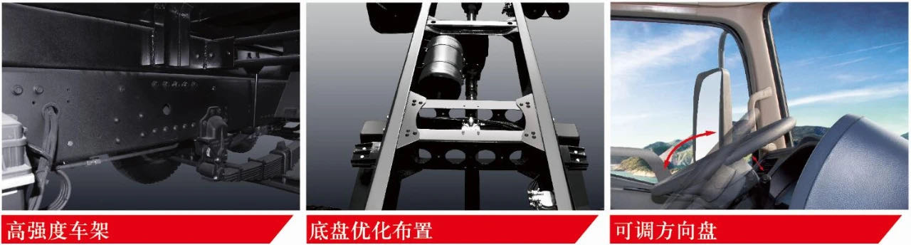 高强度车架一次性冲压成型,精度高,不变形,提高抗疲劳强度。底盘优化布置,管线束布置合理,孔位标准化,轴荷分布更合理。可调方向盘经过人机工程校核,方向柱前后、上下均可调节,满足不同用户需求,驾乘更舒适。
