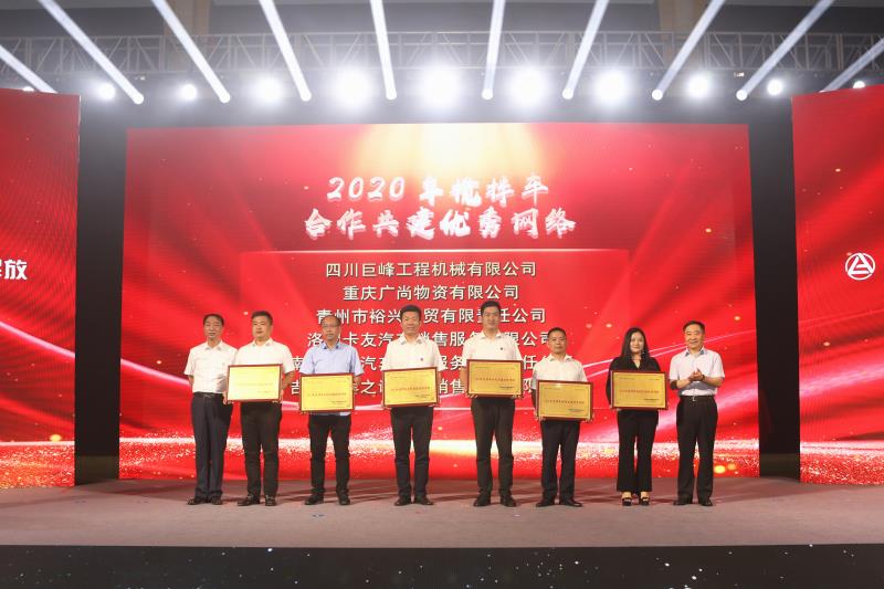 揭牌仪式上,双方还进行了联合交车和颁奖。一汽解放汽车销售有限公司专用车部部长李铁军、凌宇汽车副总经理兼营销公司总经理胡柏林共同把象征着产品的金钥匙和车模交付到第1717辆车用户手中,寓意三方协作促共赢,共谱华章再起航。随后,凌宇汽车总经理刘宝山、一汽解放汽车销售有限公司副总经理霍明共同为2020年搅拌车合作共建优秀网络经销商颁奖。