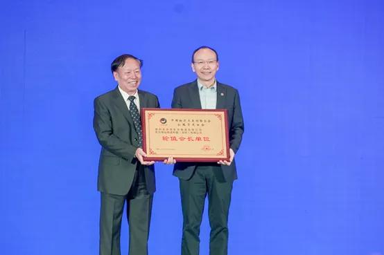 (贺登才向陈波授予公路货运分会当值会长牌匾)