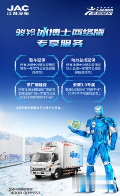骏铃冰博士网络版充分考虑到用户需求,采用“一体化”交付,使用原厂厢体,与冷藏底盘、冷机和整车一体化设计制造,生产交付周期大幅缩减,真正做到“交付无忧”。整车多处采用轻量化设计,合规自重,“上牌无忧”。联合知名冷机厂,搭载安康动力,品质可靠。全国联保,一对一专属管家,服务更加省心。超低首付,超低利息,轻松将车开回家。“五大无忧”的使用保障,切实做到降本增效,为用户带来更高效的运力和更丰厚的报酬。