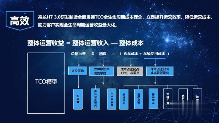 快运行业对效率、效益的高追求成为其高效转型的内生动力,为助力快运行业高质量发展,乘龙以深厚造车底蕴及技术优势为依托,不断为运输行业带来高效率运输装备。作为品牌焕新首款力作,乘龙H7 3.0从研发制造伊始便贯彻TCO全生命周期成本理念,立足降本增效,对动力、货容量和续航里程等做出重点优化,助力客户实现全生命周期运营收益最大化。
