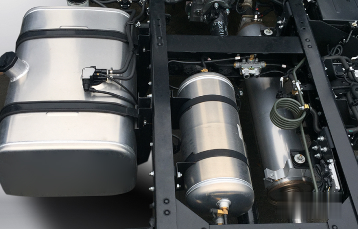 骏铃冰博士网络版在变速器外壳、油箱、侧防护等多处应用铝合金材料,质量变轻的同时耐腐性更好。底盘采用少片簧悬架设计,货箱底板骨架上大量应用了高强钢。另外,江淮骏铃部分车型还采用无内胎设计,不仅减少了内胎和垫带,轮辋也由两件式变为了一件式,合理的减轻了整车的自重。