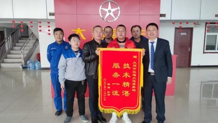 大同客户郜师傅,一次性购买大运国六燃气车7台,其中一台车发动机频报故障,郜师傅去了别的服务站,问题没有得到解决,怀着一丝希望来到大同运通服务站,该站高度重视,迅速了解车辆情况,与发动机厂家对接维修方案,并派专人进行跟踪验证,很快将故障排除。客户多日来紧绷的心情瞬间放松,为表示对大同运通的感谢,特赠送锦旗一面。经过此事,客户对大运品牌更加信赖,于年底再次购买两台大运重卡,并表示以后用车只买大运品牌。