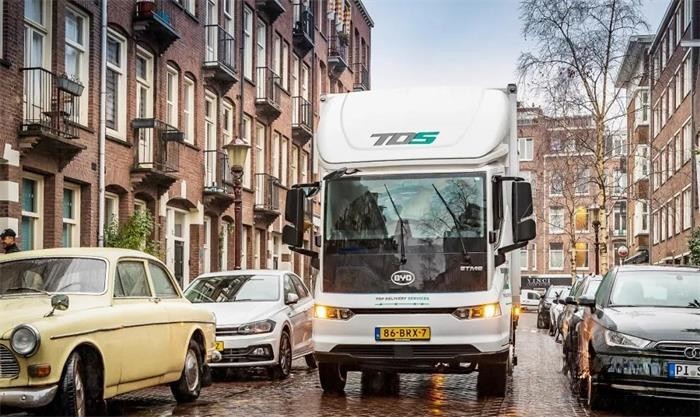 比亚迪纯电动卡车行驶在阿姆斯特丹街头