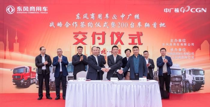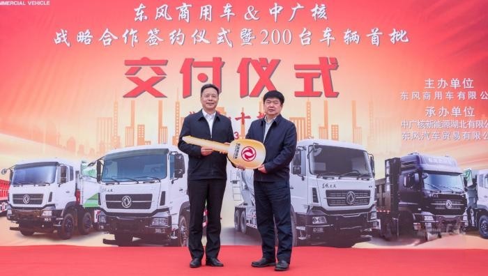 2022年3月16日,东风商用车与中广核战略合作签约仪式暨200台车辆首批交付仪式在十堰举行。东风汽车集团有限公司总经理助理,东风商用车有限公司董事长、党委书记周先鹏,中广核新能源湖北有限公司党委书记、总经理雷政平等出席仪式,并交接象征双方携手共进的“金钥匙”。此次战略合作,东风商用车与中广核将最大化发挥各自优势资源,积极推动行业向上发展,共同建设“绿色”湖北。