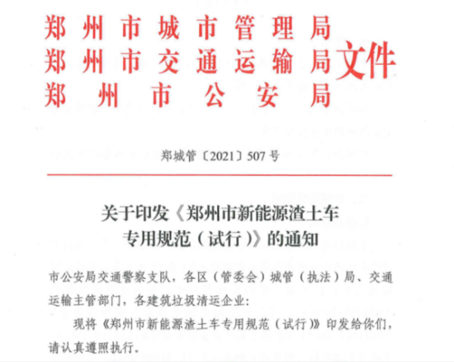 2021年11月郑州市下发的《郑州市新能源渣土车专用规范(试行)》的通知,要求规范新能源的装配要求,且符合各类强制性标准要求。