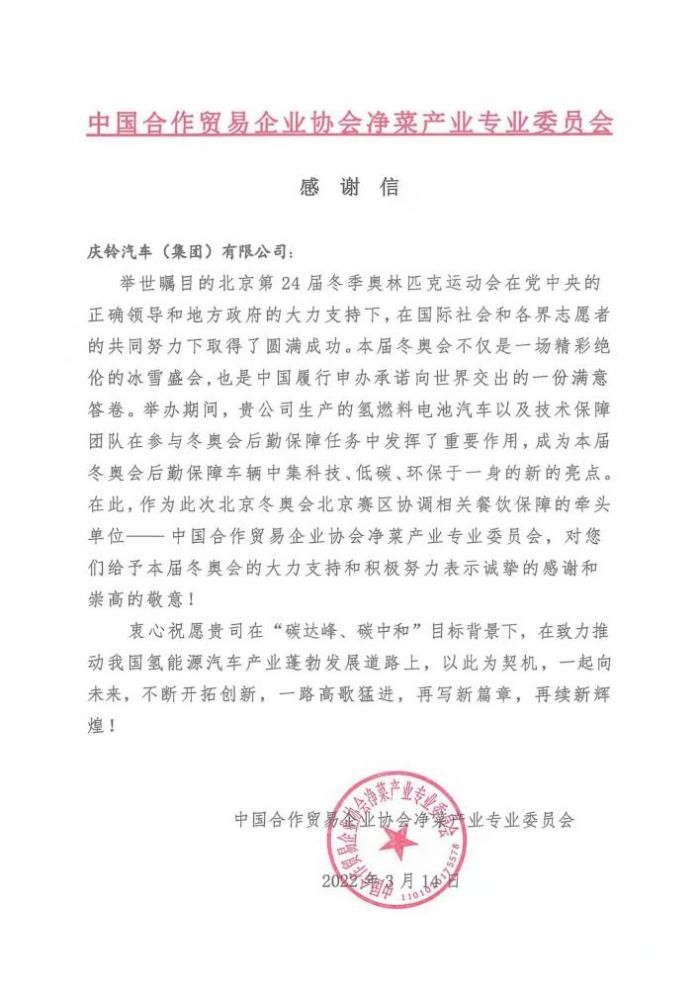 2022年3月份,庆铃汽车收到了一份来自“中国合作贸易企业协会净菜产业专业委员会”的感谢信,表彰庆铃汽车生产的氢燃料电池车以及技术保障团队在参与冬奥会后勤保障任务中发挥的重要作用,称庆铃氢燃料车是冬奥会后勤保障车辆中集科技、低碳、环保于一身的新亮点。