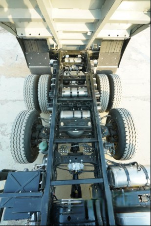 很多卡友在工程运输中常常会碰到重载起步难、爬坡难的问题,动力不足占很大原因。瑞沃金刚炮(6x2悬浮桥)全系搭载玉柴YCK05240-60发动机,排量为5.13L,满足国六的排放标准,最大动力输出240马力,在1200-1600转速区间就可以爆发900N.m的峰值扭矩,爬坡脱困性能优越,满足工程车重载工程运输需要,同时搭配法士特十档变速箱,头挡速比12.09,最高挡速比0.78。大传动比让车辆爬坡能力更强,轻松应对各种复杂的工况。底盘方面,这款车搭载的是457的重载后桥,速比为5.833,板簧方面采用10/7/12+9形式的多片簧设计,这一系列为重载而设计,让金刚炮的承载能力显著提升。