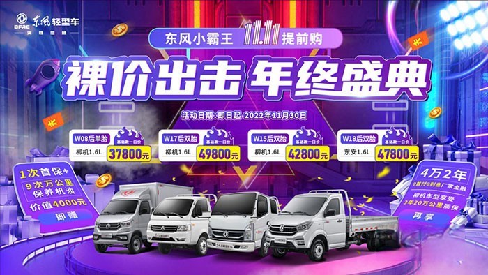 可以想象,拥有这样一款车,想要摆摊赚钱肯定是如虎添翼。为了更好的助力“地摊经济”发展,更为了让每一位卡友师傅能够走出属于自己的“致富路”,东风小霸王即日起至2022年11月30日推出超大优惠,内容如下: