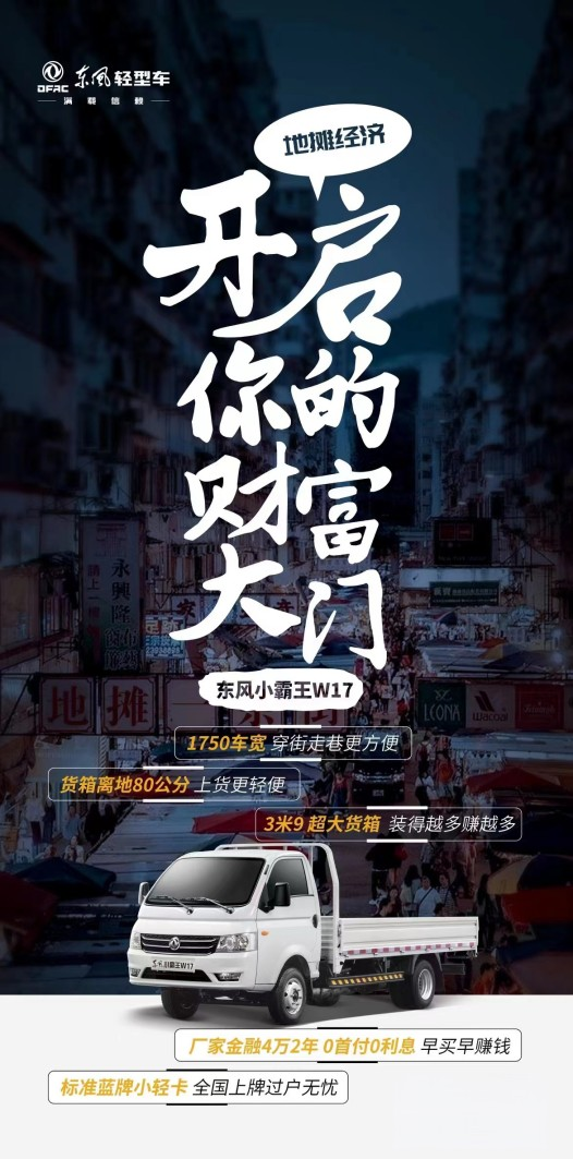 摆地摊需要进货、运输、售货,东风小霸王蓝牌合规,进出城无限制,能载货载人,宜商宜货又宜家。与轻卡车型相比,车身较小,比较灵活,占据摊位的空间较小,适合街头巷尾摆摊,整车高度低于2.1米,收摊后还可以下地库,便于收摊后停放和储存。